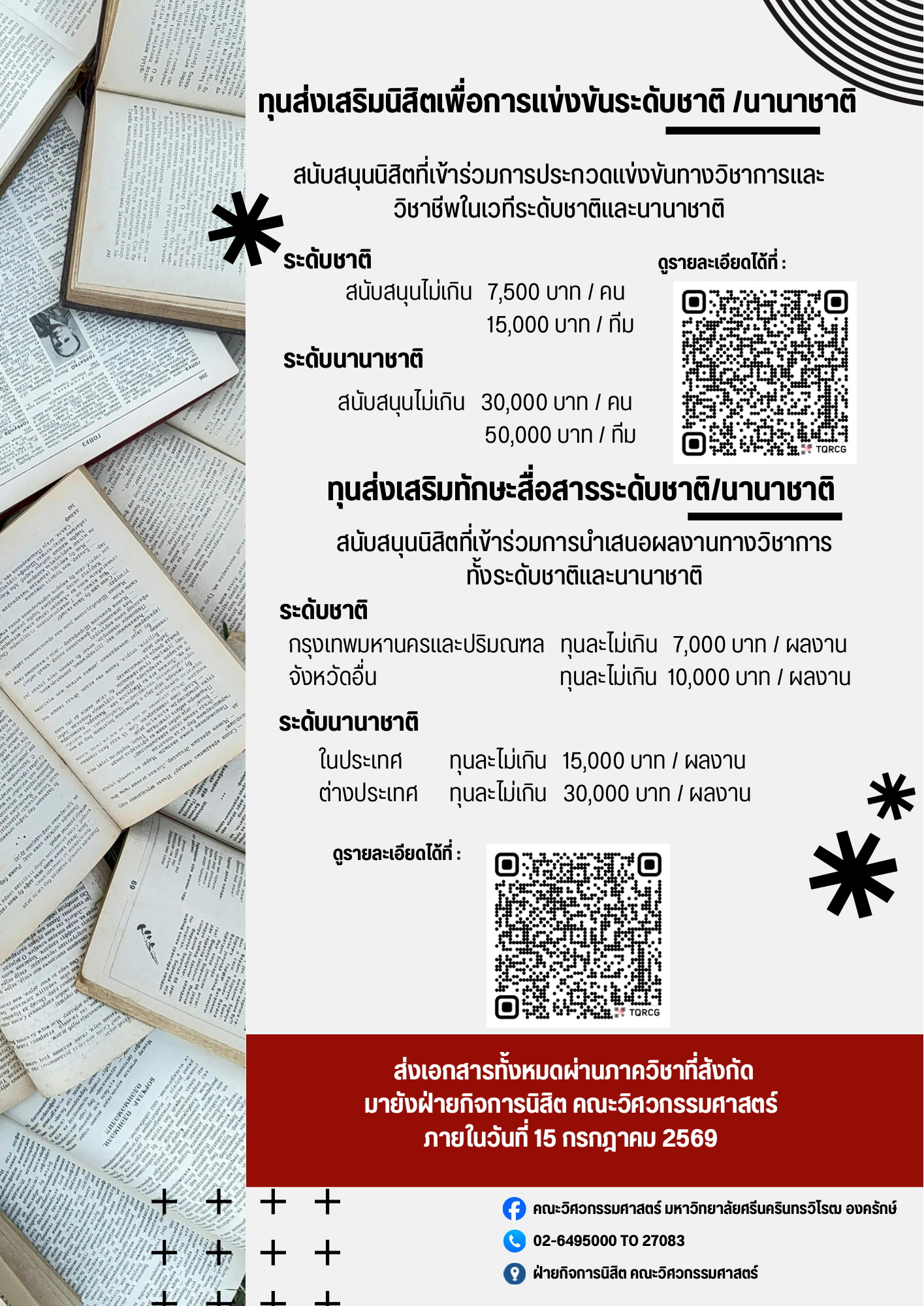 ผู้ขอรับทุนส่งเอกสารหลักฐานประกอบการขอรับทุนมายังฝ่ายกิจการนิสิต คณะวิศวกรรมศาสตร์ ก่อนวันประกวดแข่งขันอย่างน้อย 30 วัน ผ่านภาควิชาที่สังกัดได้ตั้งแต่บัดนี้ จนถึงวันที่ 15 กรกฎาคม 2569 (โดยจะพิจารณาจากวันที่หน่วยงานสารบรรณ งานบริหารและธุรการ คณะวิศวกรรมศาสตร์ ได้รับเอกสารฉบับจริง)