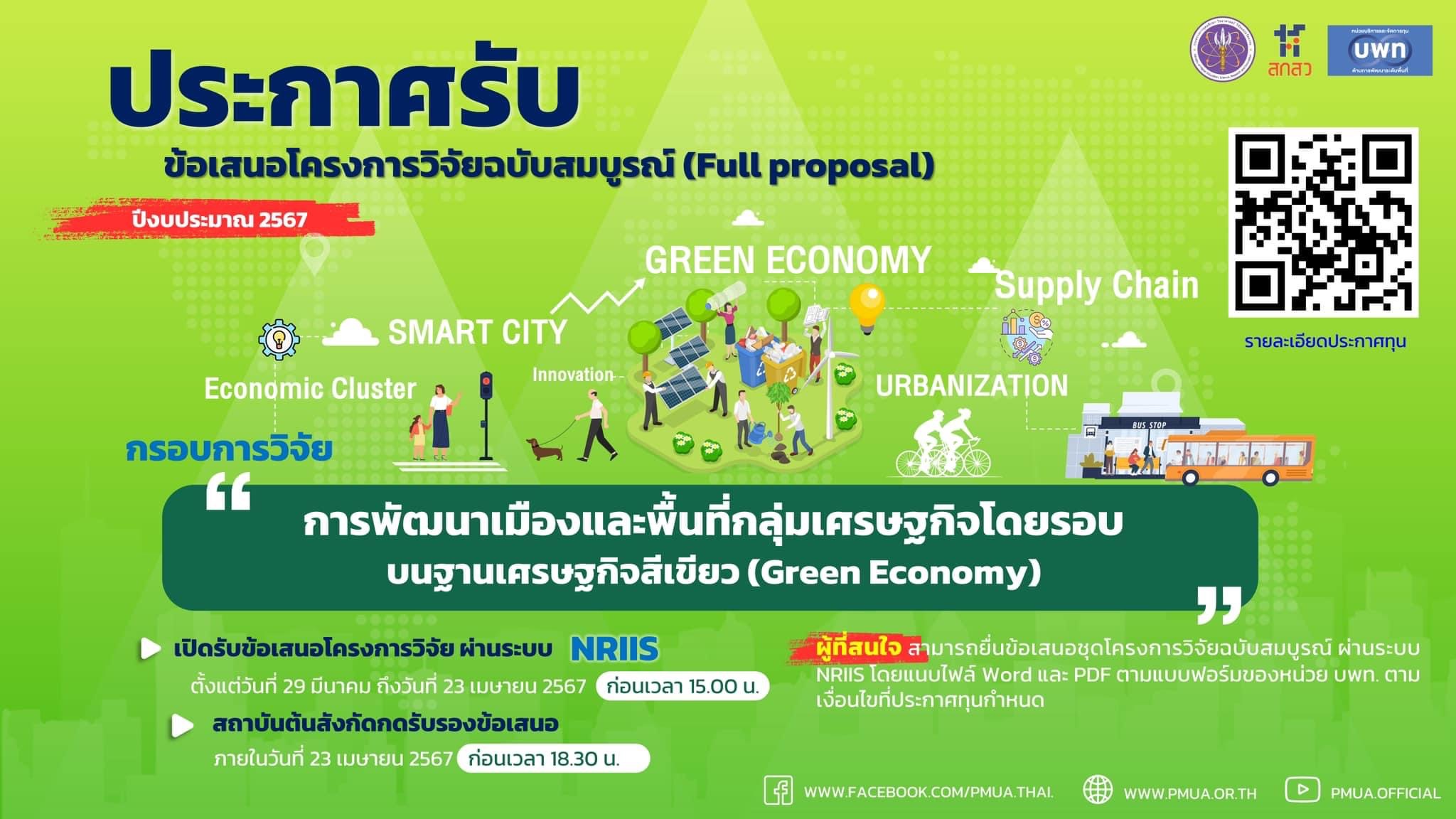 📚ผู้สนใจสามารถศึกษาประกาศข้อเสนอโครงการวิจัยฉบับสมบูรณ์ กรอบการวิจัย “การพัฒนาเมืองและพื้นที่กลุ่มเศรษฐกิจโดยรอบบนฐานเศรษฐกิจสีเขียว (Green Economy)” และดาวน์โหลดแบบฟอร์มได้ที่